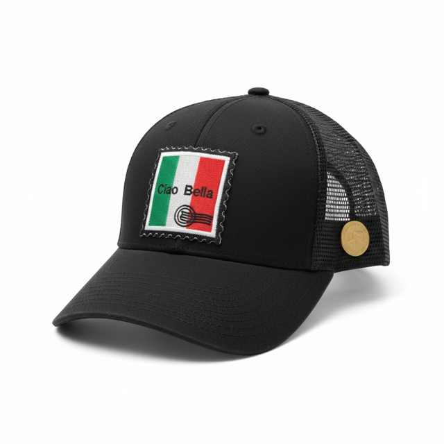 A chic nod to Italian style and effortless confidence, the Ciao Bella Trucker Hat features a stamp-style Italian flag patch with classic lettering. Finished with our signature vintage Italian Lira coin on the side, this hat blends European charm, travel nostalgia, and everyday wearability—easy, timeless, and unmistakably La Vaux.