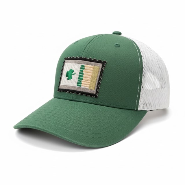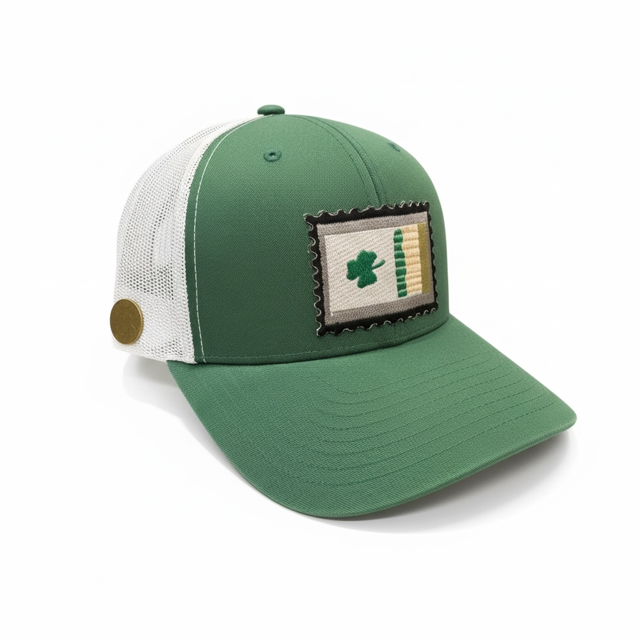 A classic green trucker with a vintage clover stamp patch, celebrating Irish heritage and timeless tradition.