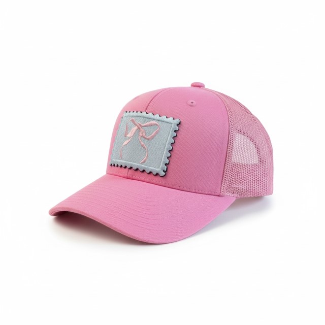 Soft and romantic, this blush pink trucker features a vintage stamp-style bow patch inspired by the iconic LoveShackFancy aesthetic. Feminine, playful, and effortlessly chic.