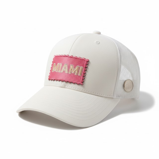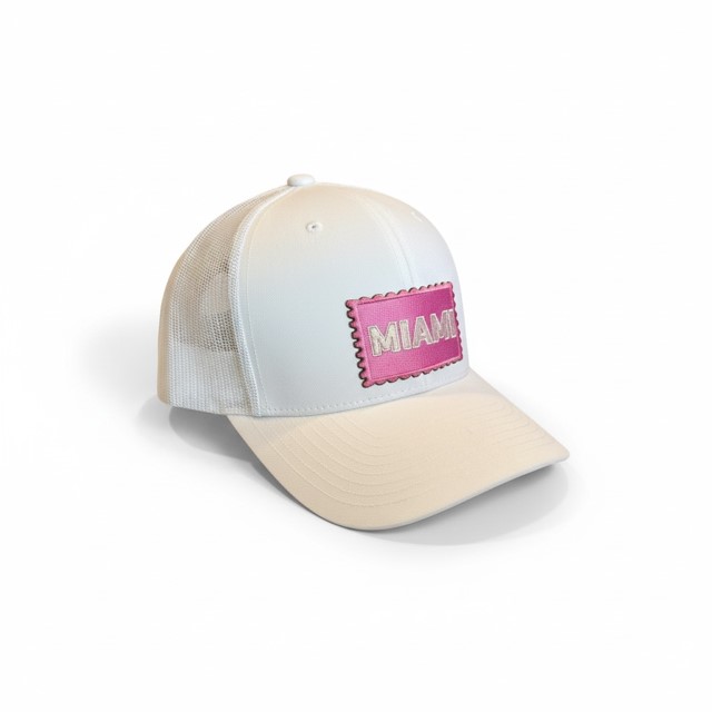 Bright and playful, this Miami stamp trucker captures coastal energy and pastel glamour with a soft pink vintage-style patch.