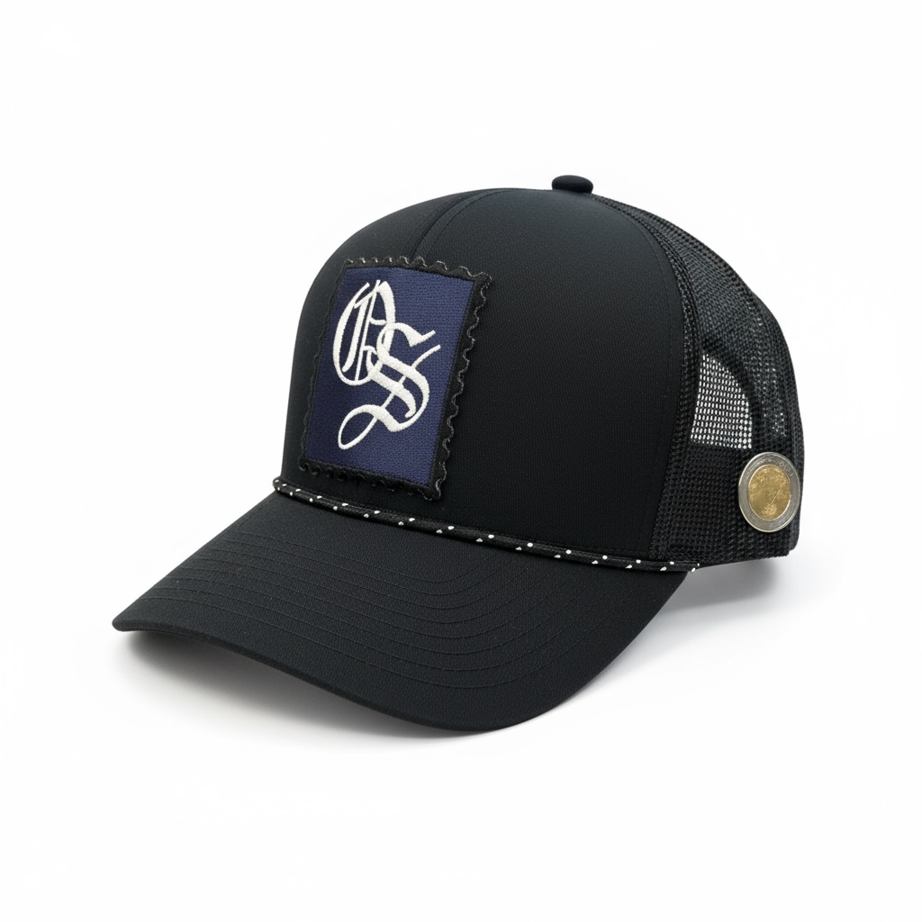 Classic and distinguished, The Old Sandwich pays homage to one of Massachusetts’ most iconic private golf clubs. The navy and white monogram patch, framed in La Vaux’s signature stamp-style border, captures a refined coastal aesthetic rooted in tradition and sport. The structured black crown and mesh back make it both breathable and bold, while the stitched rope detail adds a subtle touch of timeless charm.