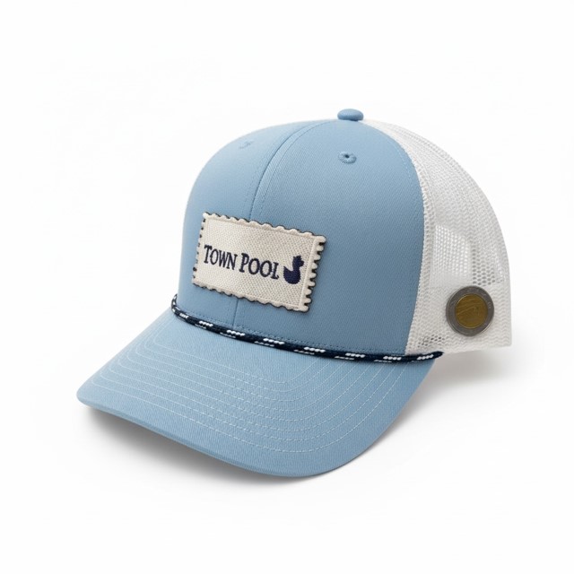 This soft blue trucker is inspired by summer days at the Town Pool—sun-washed afternoons, salty skin, and kids racing to the deep end. Finished with a stamp-style Town Pool patch, rope brim detail, and La Vaux’s signature vintage Italian lira coin, it’s an easy favorite made for island summers and everyday wear.