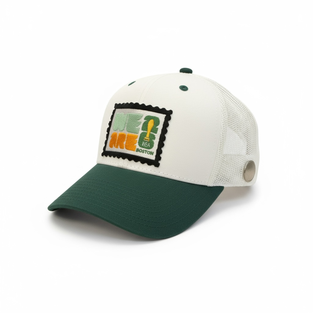 Celebrate Boston pride and championship energy with this We Are Boston trucker hat — a tribute to the city’s unstoppable spirit and love for its teams. Featuring a bold green-and-gold stamp-style patch inspired by the 2024 NBA Finals victory, this hat blends vintage design with modern edge. The white front, green brim, and signature La Vaux Italian lira coin on the side complete the look — perfect for game day, parade routes, or repping Boston wherever you go.
